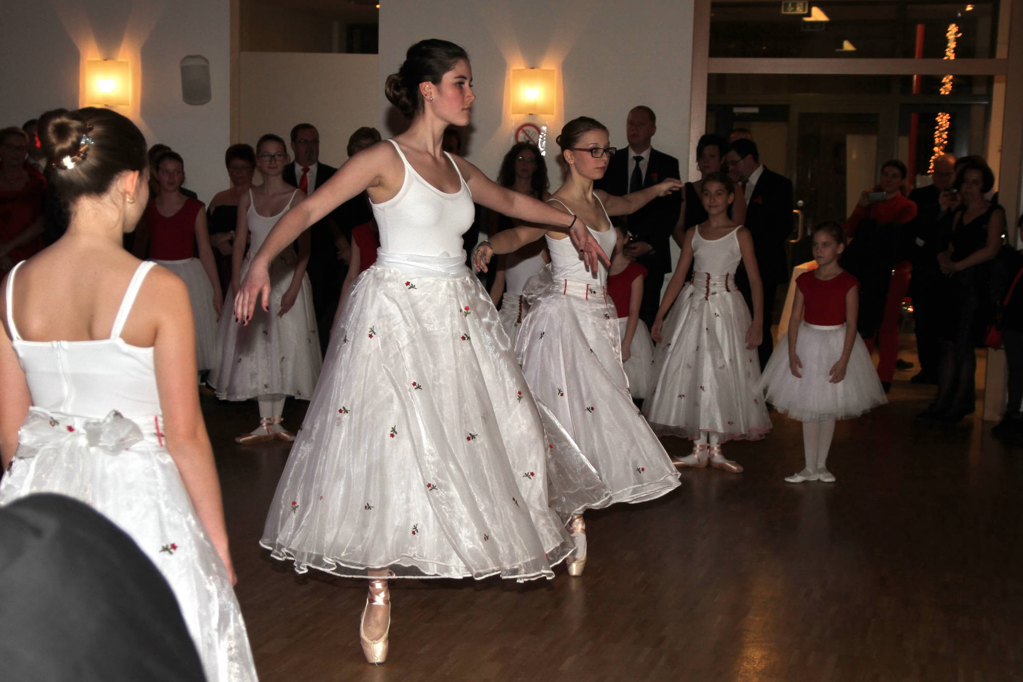 Nach dem Einzug der Eröffnungspaare der Polonaise der Tanzwelt Zehender schwebten die Ballettschülerinnen in roten Kostümen zu einem Walzer übers Parkett des Sparkassensaals. Anschließend eröffneten die Paare auch zu Walzerklängen die rauschende Ballnacht.